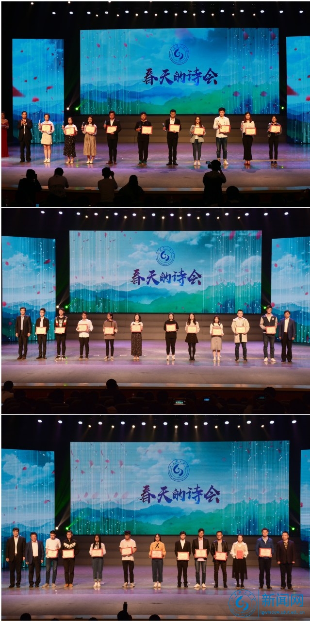 开幕式结束后,第五届“春天的诗会”颁奖晚会正式开始。舞台上灯光闪烁,朗诵者情感饱满,语言铿锵有力,倾情演绎《梦想·希望》《南京雪》《遇见美丽》《水调歌头·明月几时有》《干了这杯酒》《少年心志》等,将爱国情怀、春意盎然、梦想希冀、抒情咏怀、少年壮志描绘铺陈开来,言语间展示了春回大地之美景、时代风云之流转、学子奋发图强之风采,以诗言志、以诗言情,抒发人生奋进之感悟,令人陶醉其中。
