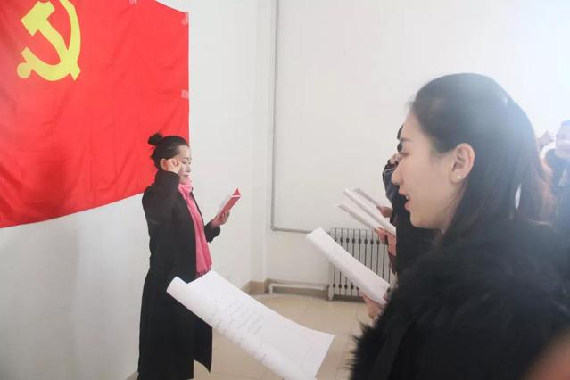 最后,进行预备党员宣誓仪式,仪式在激昂的《国际歌》中开始,施海花带领全体人员进行宣誓,面对鲜红的党旗,每个人举起右手,铿锵有力地宣读誓言,这是每个党员必须经历的一次洗礼。 于飞代表新发展党员发言,他表示:非常激动和光荣的加入党的组织,一定会时刻不忘自己的党员身份,吃苦在前,享受在后,不断提升个人素质和思想政治修养,发挥先锋模范带头作用。党员代表杨钰菡发言,他希望新党员不忘初心,始终保持为什么入党的初心,强化责任担当,在思想上、政治上、行动上和党织保持高度一致,成为在老师和同学们信赖的好党员。