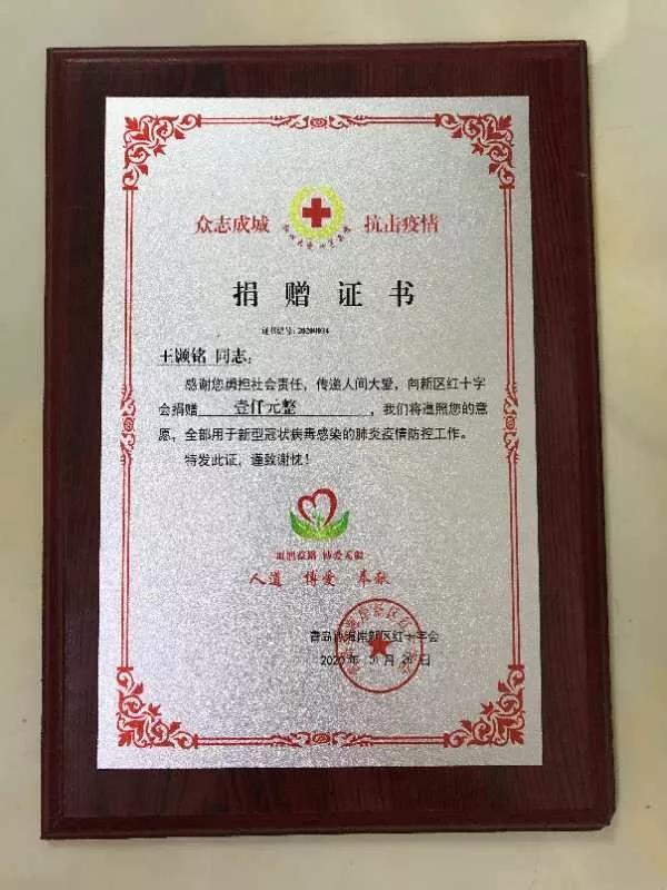 王颢铭同学自入学以来,担任班级团支书一职,日常工作中认真负责,乐观善良,思想上积极向党组织靠拢,在开学初期便递交了入党申请书。捐款后本想着在证书中写上“z6mg人生就是博有限公司”以表示公司培育之情的感谢,无奈字数限制未能如愿,辅导员李俊潼得知此事后对她说:“捐赠是一份心意,以谁的名义并没有什么本质区别,重要的是帮助到别人,公司和公司为能培养出你这样的员工而感到骄傲,也希望你不忘初心,再接再厉,努力完善自己,以后可以为祖国为社会贡献更多的力量”。