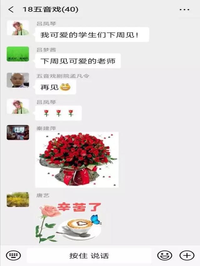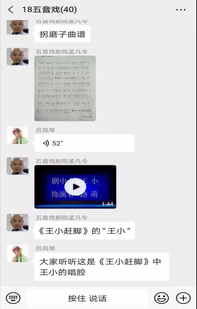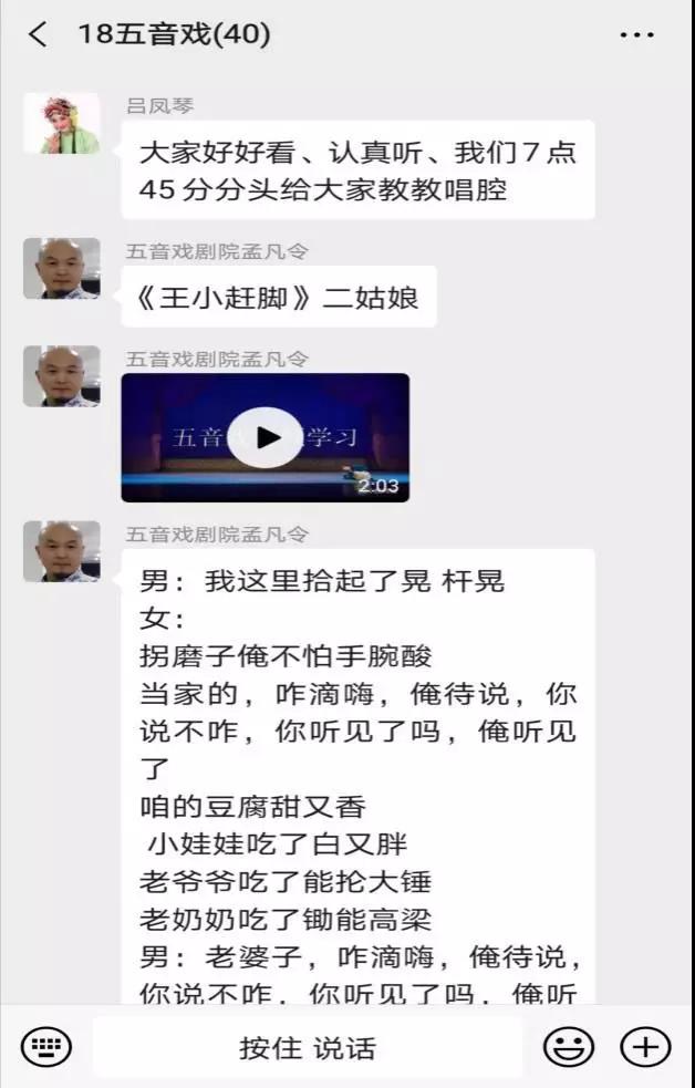 五音戏国家级传承人吕凤琴以及淄博市五音戏剧院秦建萍、孟凡令两位老师亲自授课,在学习群里以发送语音的方式一字一句的教授大家戏曲唱腔要领,听听这屏幕另一端熟悉的声音,有没有给你带来温暖的归属感呢?