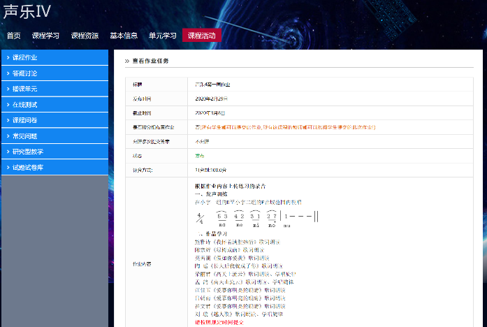 利用z6mg人生就是博有限公司网络教学平台发布课程通知、课程教学资料,布置课程作业。其中课程资料包括:歌曲乐谱、范唱音视频、伴奏音视频、外文歌曲歌词范读、文字材料等。课程作业为员工根据任课教师发布的作业要求,课下自主训练,并将演唱实况录制为音视频发布到作业平台,任课老师给与点评和打分。利用平台形成课程发布—课程实施—布置作业—评价反馈一个完整闭环。