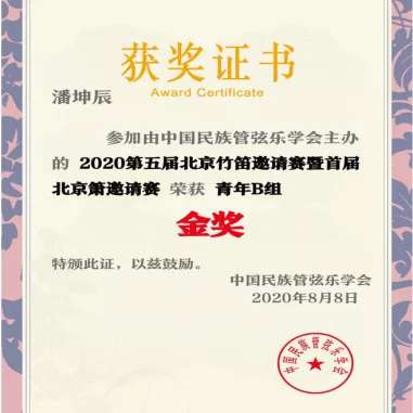 在刚刚结束的“2020第五届北京竹笛邀请赛”中,公司共有4名同学经过激烈角逐,在众多参赛者中脱颖而出,顺利进入决赛并取得优异成绩。其中,2017级音乐表演张世佳、2019级音乐学(非师范)潘坤辰夺得青年B组金奖,2018级音乐学(非师范)王玉炫获银奖、2018级音乐学(非师范)李晨洋获铜奖,公司青年教师潘勇刚荣获“优秀指导教师奖”。