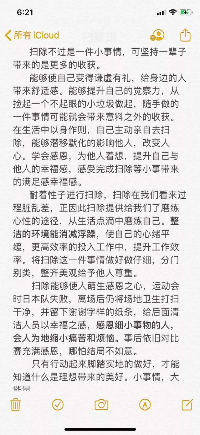 马上就要步入大学,马上就要开启新的人生篇章,必须学会这种扫除道的精神,对自己做一个清醒的认识,重新要求自己,使自己变得细心感性,使自己变得更加谦虚灵敏,做到凡事彻底”,践行”扫除道”精神。