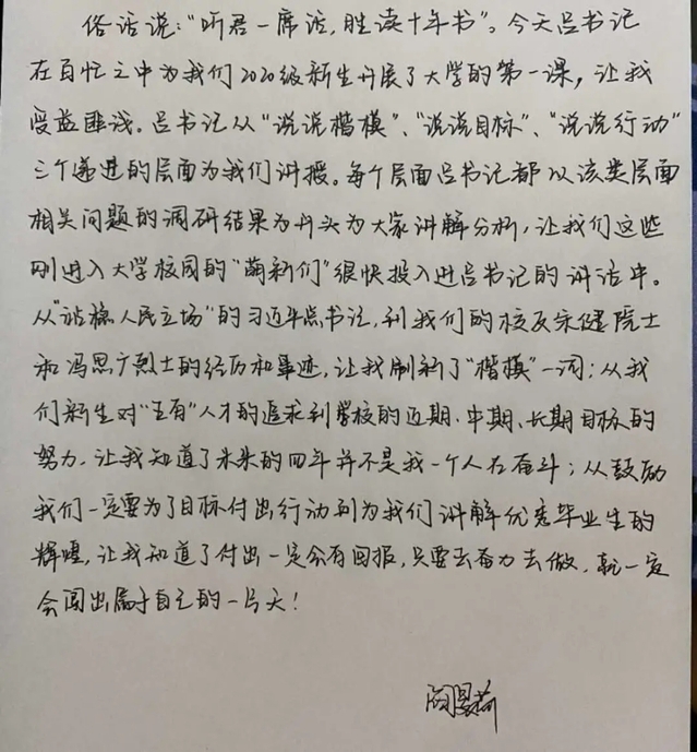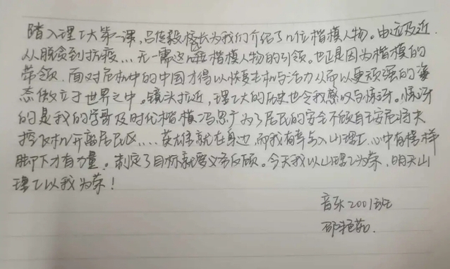 今天,我怀着无比崇敬且激动的心情迎来了由公司吕传毅书记为我们新生讲述的第一课。吕书记给我们讲述了出生于普通家庭却有无比伟大的思想观念的马克思;站在人民的立场,坚持“我将无我,不负人民”投身于强国事业的习总书记;84岁高龄“挂帅出征”的钟南山院士。这些影响国家甚至影响世界的伟大人物,都是我们青年学习的楷模。我们的山理工也是英雄和楷模的沃土,有取得突出成绩的科学家,有舍己为人的英雄飞行员……他们都是我们的青春偶像!我们会制定明确且清晰的目标,刻苦学习,努力实践,努力成长为可堪民族复兴大任的新时代青年!