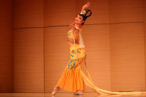 在敦煌舞蹈中,飞天形象审美独到,风格特异,具有代表性,展现其轻盈、婀娜、彩带翩翩飞舞,千姿百态的在天空中自由翱翔的情景。
