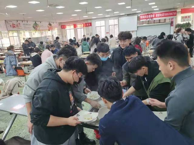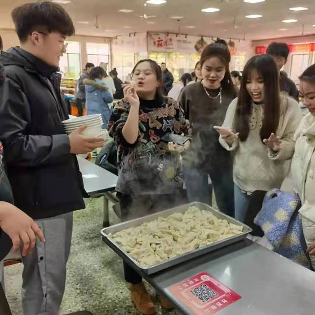 伴随着食堂水烧开的声音,热气腾腾的饺子在大家的期待中被端上了餐桌,一盘盘各式各样的饺子展现在大家面前。老师同学们一拥而上,吃上了自己动手包的饺子,一同感受着此次活动带给大家的快乐与温暖,场面十分温馨。