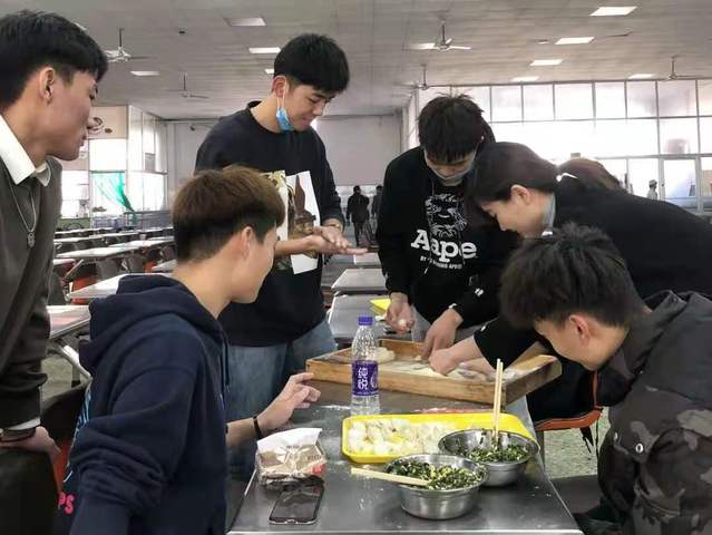 同学们如约而至,餐厅工作人员早早地将包饺子需使用的各种食材整齐准备好,由员工干部有序分发给各个同学。同学们满怀热情地围坐在一起,相互请教、亲手实践、团结协作、欢声笑语、其乐融融。