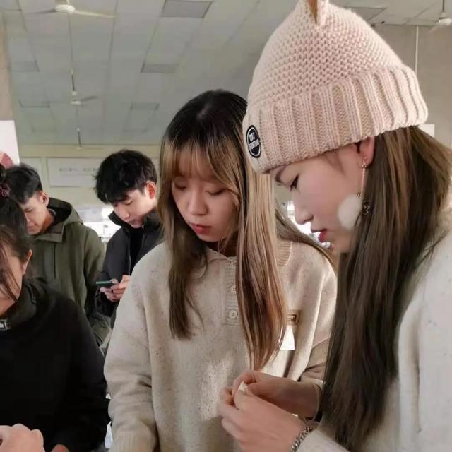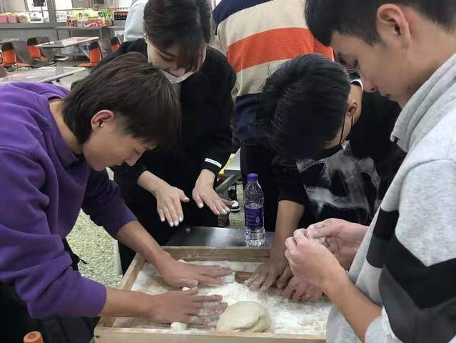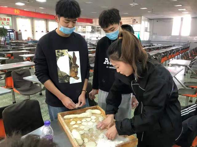 同学们如约而至,餐厅工作人员早早地将包饺子需使用的各种食材整齐准备好,由员工干部有序分发给各个同学。同学们满怀热情地围坐在一起,相互请教、亲手实践、团结协作、欢声笑语、其乐融融。