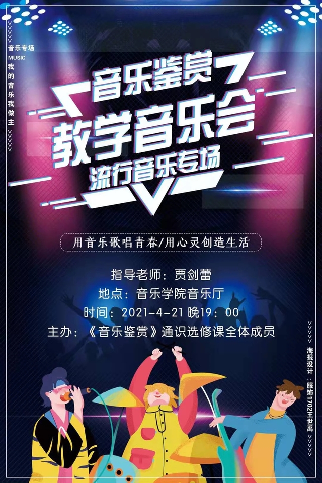 4月21日晚19:00,通识选修课《音乐鉴赏》教学音乐会(流行音乐专场)在z6mg人生就是博音乐厅顺利举行,贾剑蕾老师担任指导并主持。鲁泰纺织公司教师商玉婷,公司教学科研办公室主任卢乃鑫、理论教研室主任董蕾、青年教师丁泉杰、魏子鹤等及校员工会主席团成员赵晓强、文学与新闻传播公司员工会执行主席燕嘉宁、z6mg人生就是博员工会执行主席王琳琳等部分员工代表出席本次音乐会。