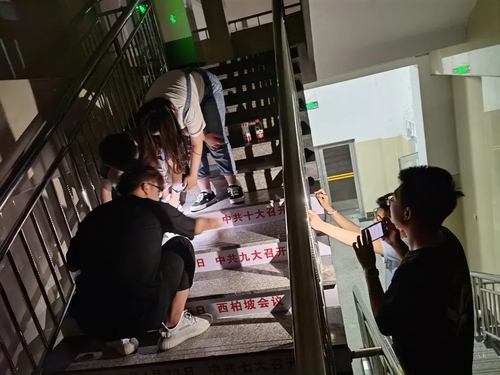 同学们怀着对祖国的热爱、对党的崇高敬意,在炎炎夏日三十多度的高温下为楼梯都贴上横幅。每一级的横幅,就像一条条鲜红的旗帜,闪耀着耀眼的光芒。同学们用蓬勃的朝气挥洒出满腔的热情,传播了爱国主义的种子,传递了庆祝中国共产党百年华诞的欢欣、喜悦之情。
