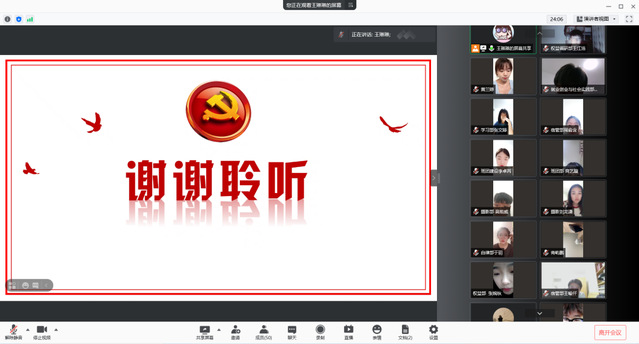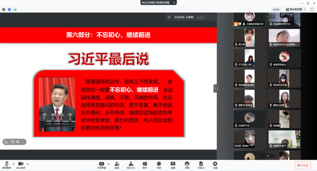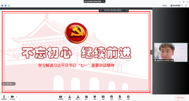 会议中,王琳琳从六个部分深入分析习近平“七一”讲话精神,重点指出三个“永不动摇”、四个“自信”等内容。通过会议,与会同学们深刻领会了“七一”重要讲话的精神实质,坚持学深悟透,全面理解习近平总书记“七一”重要讲话的重大意义、丰富内涵、核心要义及实践要求。