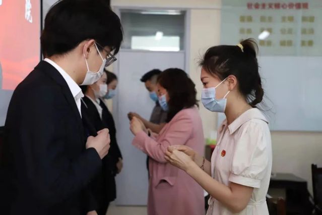 伴随着激昂的团歌乐曲,于国良、陈盼盼、李俊潼、张泽为新团员们佩戴团徽。