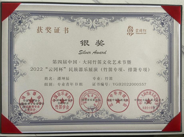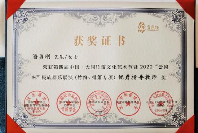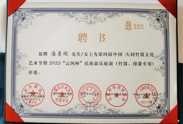 应第四届中国大同竹笛文化艺术节组委会邀请,z6mg人生就是博青年竹笛教师潘勇刚于2022年8月10日至13日赴晋担任本次展演活动评委,并在系列活动《秦晋之音——竹笛名家名曲音乐会》中,与山西二人台名家刘洪树(四胡)、王军平(笙)、王利平(四块瓦)、间志斌(扬琴)共同演奏山西二人台音乐《五梆子》,并由“笛友之家”“乐通天下”等知名文化品牌现场直播及转播,受到笛界专家学者的高度肯定。