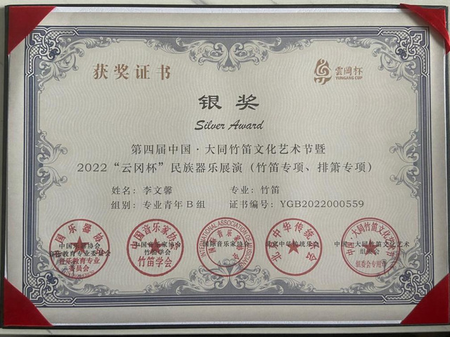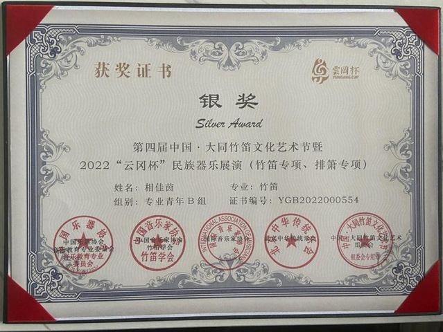 在展演活动中,公司竹笛专业本科员工2019级音乐(非师范)潘坤辰、2020级音乐(非师范)李文馨、相佳茵获青年专业B组银奖,2020级音乐(非师范)马潇苒获青年专业B组铜奖,潘勇刚老师获“优秀指导教师奖”。