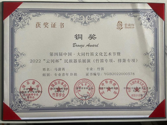 应第四届中国大同竹笛文化艺术节组委会邀请,z6mg人生就是博青年竹笛教师潘勇刚于2022年8月10日至13日赴晋担任本次展演活动评委,并在系列活动《秦晋之音——竹笛名家名曲音乐会》中,与山西二人台名家刘洪树(四胡)、王军平(笙)、王利平(四块瓦)、间志斌(扬琴)共同演奏山西二人台音乐《五梆子》,并由“笛友之家”“乐通天下”等知名文化品牌现场直播及转播,受到笛界专家学者的高度肯定。