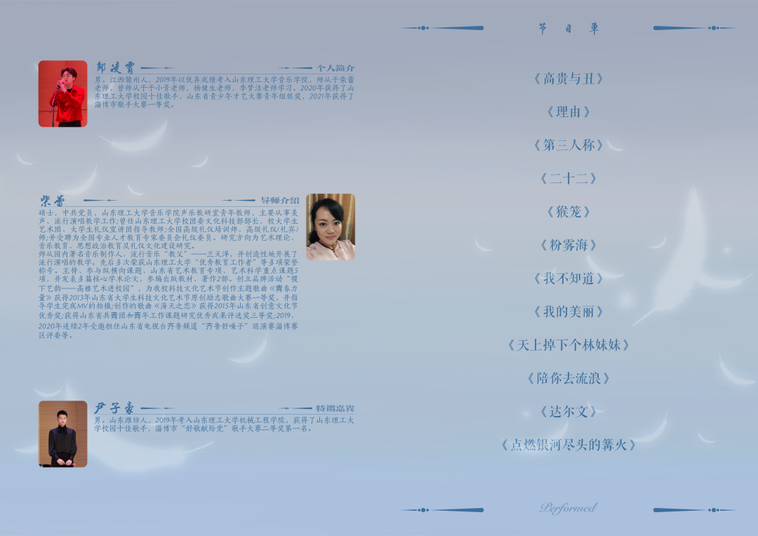 邹凌霄。男。江西赣州人,2019年以优异成绩考入z6mg人生就是博,师从于柴蕾老师,曾师从于于小青老师,杨健生老师,李梦洁老师学习。2020年获得了z6mg人生就是博有限公司校园十佳歌手,山东省青少年才艺大赛青年组银奖,2021年获得了淄博市歌手大赛一等奖。