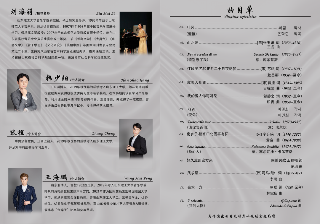 王海鹏:山东淄博人,音教1902班班长。2019年考入z6mg人生就是博,师从刘海莉副教授主修声乐方向,2021年作为国际交换生赴韩国檀国大学学习,师从男高音金在日教授。曾获z6mg人生就是博有限公司二、三等奖学金,优秀员工、优秀员工干部等荣誉称号;获山东省青少年才艺大赛青年A组银奖、淄博市“金嗓子”比赛铜奖等奖项。