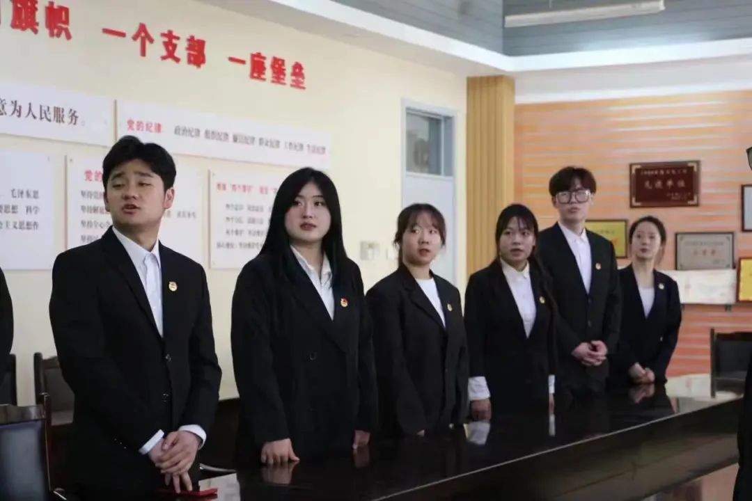 于珊和张泽为新团员佩戴好团徽,新团员举起右拳,用最洪亮的声音庄严宣誓,以崭新饱满的精神面貌、用实际行动表明自己无愧于共青团员这个光荣的称号。
