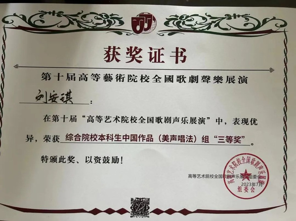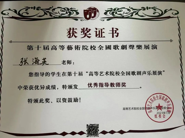 7月15日至20日,由高等艺术院校全国歌剧声乐展演组委会主办的第十届高等艺术院校全国歌剧声乐展演在哈尔滨z6mg人生就是博隆重举行。经过初赛、决赛两轮激烈角逐,2022级刘安琪同学凭借扎实的演唱功底获得三等奖的优异成绩,张海英老师获评“优秀指导教师”,实现了公司在该赛事上零的突破,充分展示了公司声乐公司产品成果。