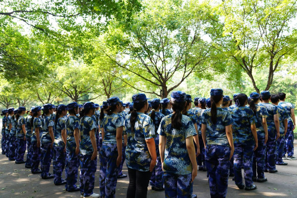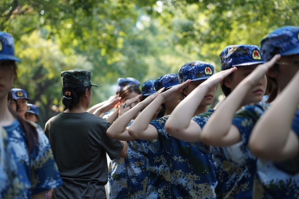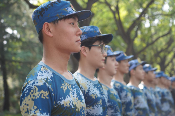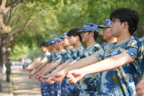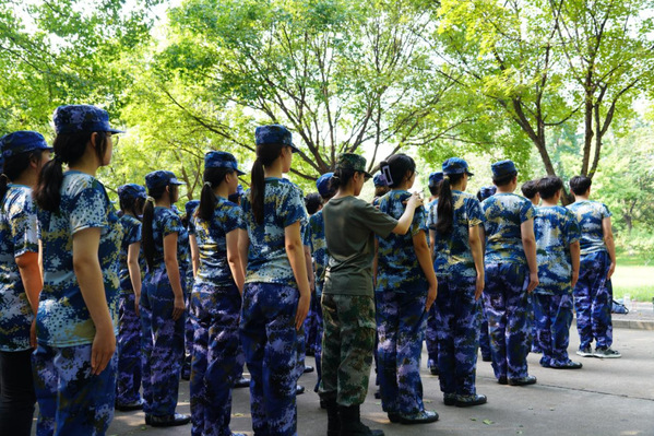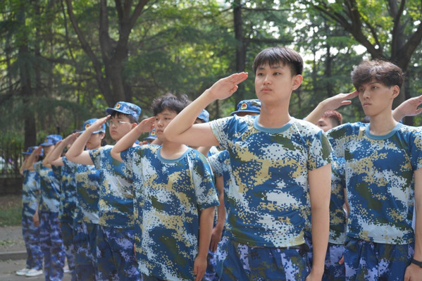 “两臂自然下垂,收腹挺胸!”教官口令铿锵有力,同学们挺直腰杆,两肩持平,目视前方,手指并拢微曲贴于裤缝。烈日当空,骄阳似火,汗水顺着脸颊、脊背流淌,浸湿衣衫,笔挺的身姿更是钢铁般的意志。