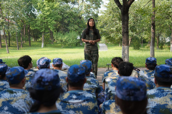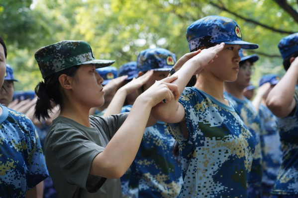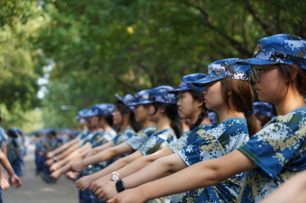 “两臂自然下垂,收腹挺胸!”教官口令铿锵有力,同学们挺直腰杆,两肩持平,目视前方,手指并拢微曲贴于裤缝。烈日当空,骄阳似火,汗水顺着脸颊、脊背流淌,浸湿衣衫,笔挺的身姿更是钢铁般的意志。