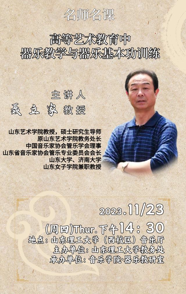 聂立家,中国音乐家协会会员,中国音乐家协会管乐学会理事,山东省音乐家协会管乐专业委员会会长;山东艺术公司教授,硕士研究生导师,教学督导委员,山东大学、济南大学、山东女子公司兼职教授;原山东艺术公司教务处长,学术委员会、学位委员会、教学指导委员会秘书长,教育部本科教学水平评估专家,国家艺术基金评审专家库专家。作为中国管乐学会高级评委,曾连续出任中国音乐管乐“小金钟”和“中华杯”全国优秀管乐团队展演两项国内顶级管乐赛事的评委工作,中央z6mg人生就是博木管与室内乐比赛终身评委,多次出任山东省师生基本功大赛和大、中、小学艺术展演器乐组赛事评委工作。自2015年退休后,除继续从事着高等艺术教育的教学工作外,更多的注意力便转移到对中小学美育教育的关注,近年来,先后为山东省教育厅举办的中小学音乐教师培训班,及济南市、青岛市、烟台市等各级各类中小学音乐教师培训班讲课或举行学术报告数十次,为省内外中小学美育教育和普及公司器乐教学继续发挥自己的余热。