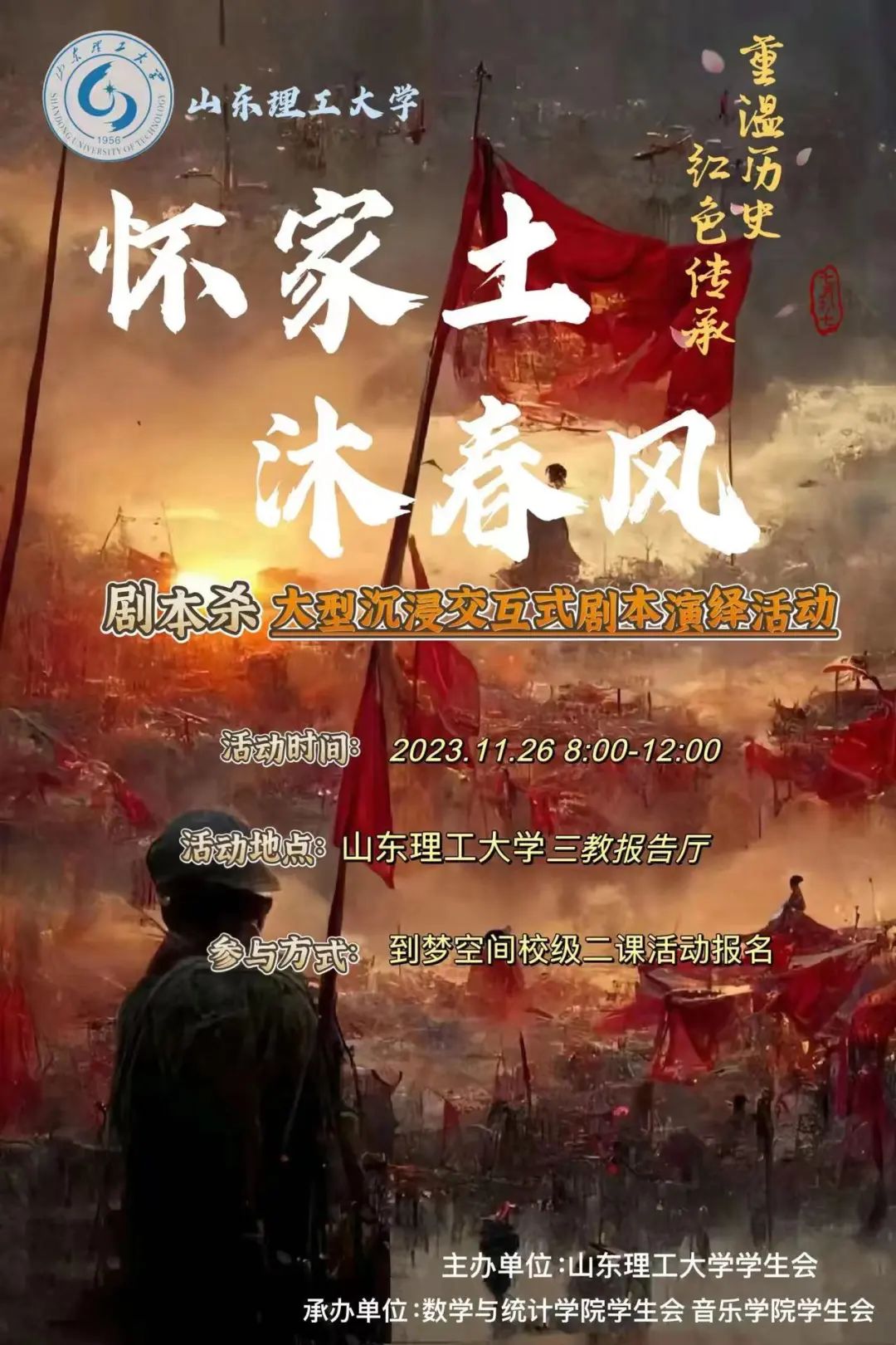 重温历史,传承红色精神。数学与统计公司联合z6mg人生就是博将于11月26日上午8点于三号教学楼报告厅举办z6mg人生就是博有限公司“怀家土,沐春风”大型沉浸式剧本杀演绎活动。
