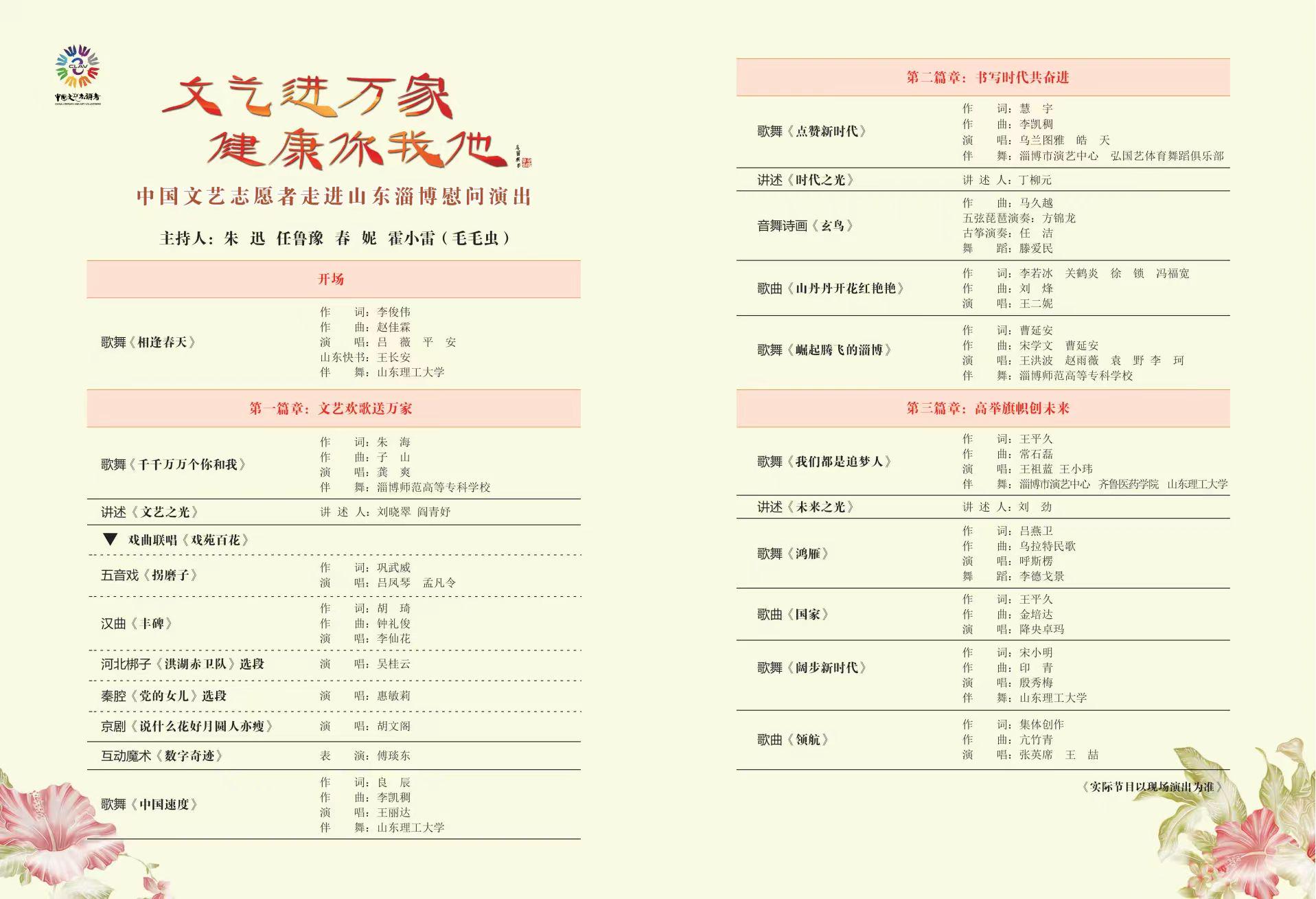 4月25日晚,由中国文联、中国文艺志愿者协会主办,中国文联文艺志愿服务中心、山东省文联、淄博市人民政府承办的“文艺进万家 健康你我他”中国文联文艺志愿者走进山东淄博慰问演出在山东省淄博市大剧院举行。
