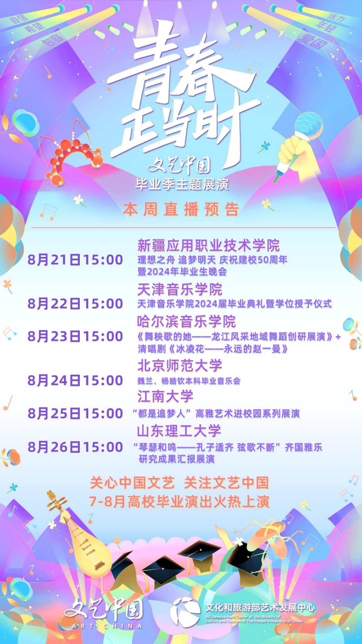 青春似火,燃情七月。7月2日晚19:30,由文化和旅游部艺术司指导、文化和旅游部艺术发展中心主办的首届“青春正当时”文艺中国毕业季主题展演——暨全国高校美育成果展示活动,在文化和旅游部艺术司官方演播平台“文艺中国”拉开了线上演播的帷幕,此次活动精心呈现了一系列由老员工演出的高水平、高规格、高质量的毕业季演出作品。开幕演出为北京航空航天大学的《闪闪发光的我们》,该晚会表演内容多元化,融合了艺术与科技,表达了对毕业生的美好祝愿。