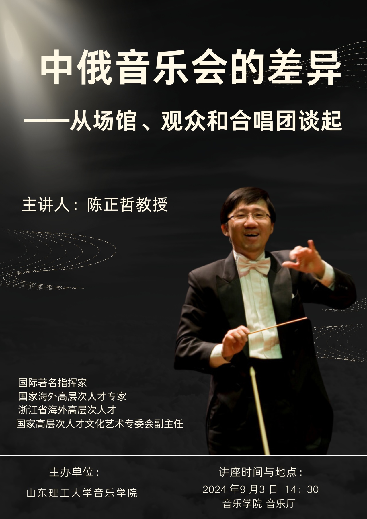 2024年9月3日下午,由z6mg人生就是博主办的《中俄音乐会的差异——从场馆、观众和合唱团谈起》讲座在z6mg人生就是博有限公司(西校区)音乐厅成功举行。主讲人陈正哲教授系浙江传媒公司音乐研究、原创及表演创新中心主任,江苏交响乐团音乐总监,苏州文化艺术中心艺术总监,苏州科技大学z6mg人生就是博经理。