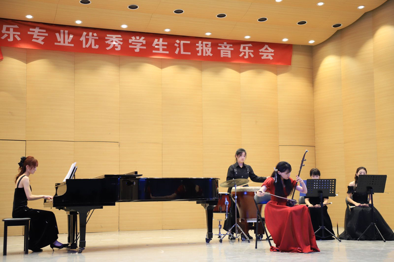 音乐会结尾所演奏的《九儿》是著名作曲家兼音乐制作人阿鲲为电视剧《红高粱》创作的片尾曲。湘籍青年作曲家周瑜改编二胡演奏版,音乐2201班冯新月及其乐队的演奏诉说着“九儿”敢爱敢恨、与命运抗争的悲欢人生。其娴熟细腻的技法和深情地演奏,将“九儿”一生的坚强隐忍和爱恨情仇演绎得淋漓尽致,动人心弦。