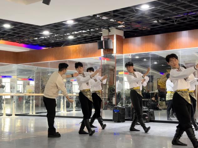 首先由舞蹈2301班的员工进行了维族舞蹈组合的表演,由达连为男生讲解示范,接着舞蹈2401班的员工进行了藏族舞蹈组合的表演,由万马仁增为其示范指导。最后两位展示了自己民族的经典剧目。