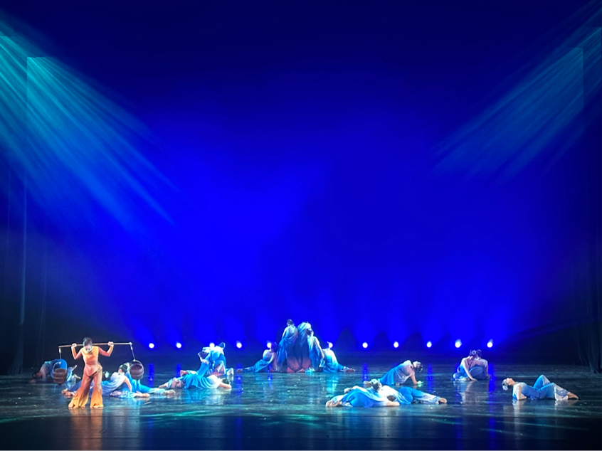 舞蹈《孝妇河的诉说》,由舞蹈教研室青年教师谭威、李佳奕创排,21级、22级舞蹈表演专业员工参演。作品取材自流经淄博的“母亲河”——孝妇河的传说故事,其中所指“孝妇”,是为《齐乘》中记载的女子颜文姜,她事亲至孝,远道取水不以寒暑易心。作品借由传说故事,运用山东民间舞蹈元素,将秀美河景与颜文姜事迹融汇于舞台之上,营造出孝水潺潺、孝心可感的动人景象。