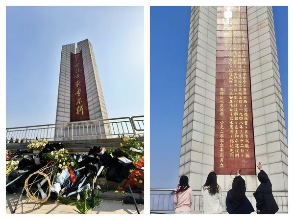 沿着108级台阶可到达山顶,耸立于山巅的是一座19.99米高、状似三把利剑的纪念碑,纪念碑下面三层大小不一的底座,象征着已经被我军民推翻的三座大山,朝北的正面红色大理石上镌刻毛泽东主席手书“革命烈士永垂不朽”八个金字,朝向东南、西南方向的两面刻有建设新陵园的碑文。同学们站在纪念碑下,朗读着碑文,不断撞击着同学们的内心。