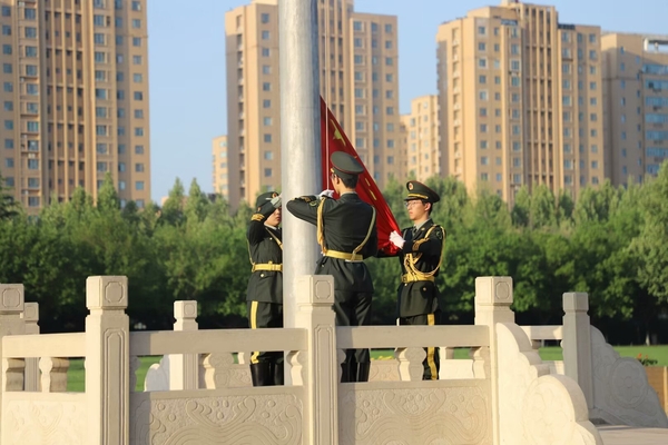 清晨6:30分,伴随着激昂的国歌声,护旗手迈着铿锵有力的步伐护送国旗至升旗台下。在全场肃穆的目光中,五星红旗冉冉升起,迎风飘扬,奏响一曲庄严的爱国赞歌。