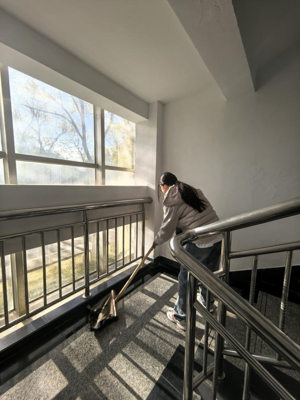 活动伊始,两班同学迅速集结,在老师的简单指导下明确分工,分组包干公司各个卫生区域,涵盖公司大厅、楼梯、走廊、琴房、内庭院等重要场所。舞蹈班同学们充分发挥其灵活性与协调性优势,在狭窄的走廊与角落里穿梭,细致清扫每一处积尘,擦拭栏杆与门窗,不放过任何卫生死角;音乐教育班的同学们则凭借耐心与毅力,认真清理着琴房较为复杂的区域,对大厅内的桌椅仔细擦拭、摆放整齐。