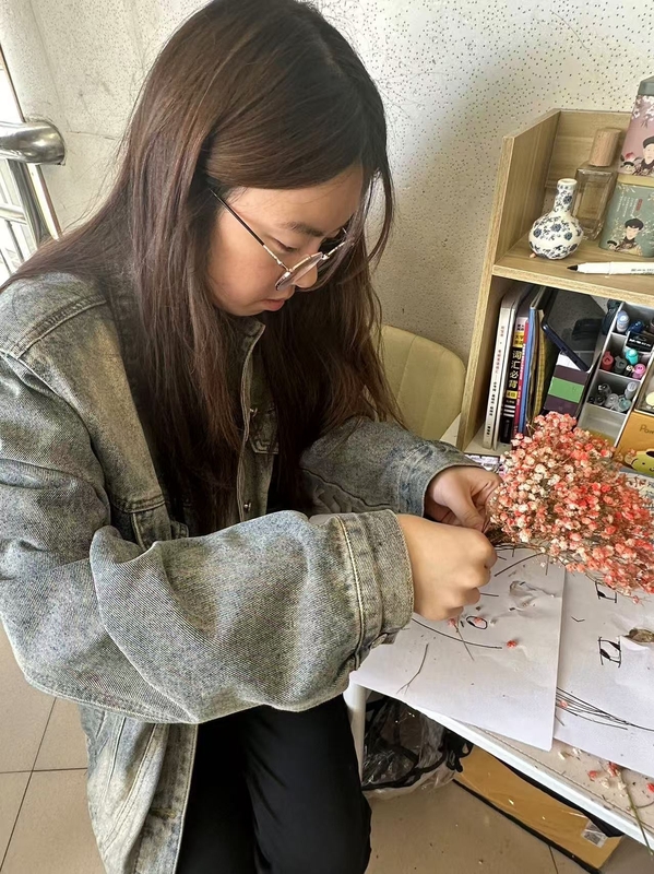 团支部成员们将干花变废为宝,体现其中价值。“以前觉得干花只是枯萎的植物,现在发现它们像被封印的宝藏!”支部成员姜海硕分享创作心得。她将干花一片片粘在卡片上,一串栩栩如生的葡萄出现在我们眼前。