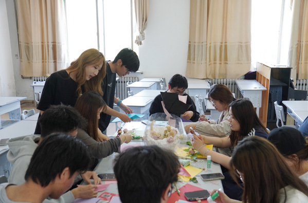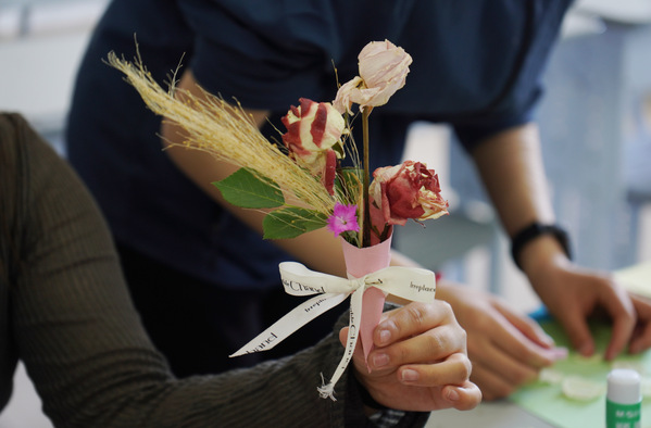 活动现场,色彩斑斓的卡纸、水彩颜料与各样的花草巧妙碰撞。支部成员们或低头专注拼贴,或三两成群讨论构图。有人用花瓣勾勒出抽象的春日图景,有人以卡纸为包装,将干花包裹变成永不凋零的花朵。每一幅作品都承载着独特的巧思,将春日的浪漫定格为永恒。