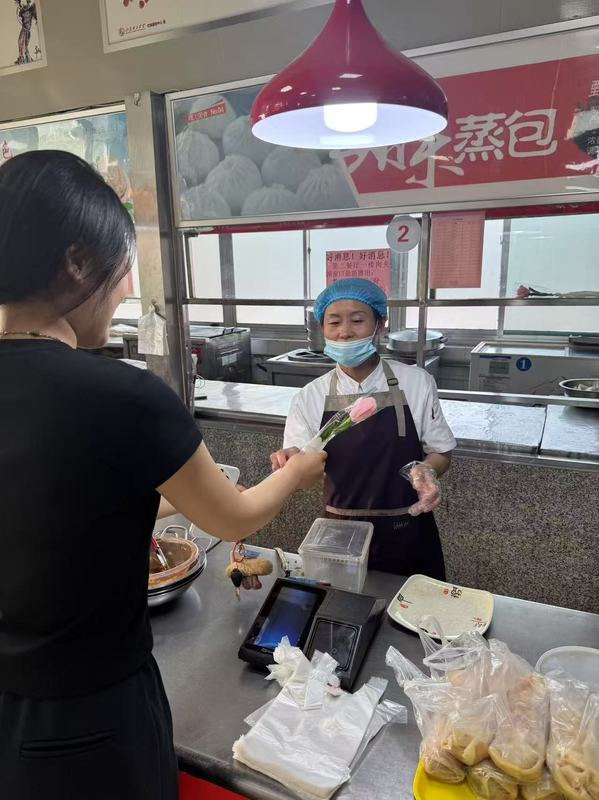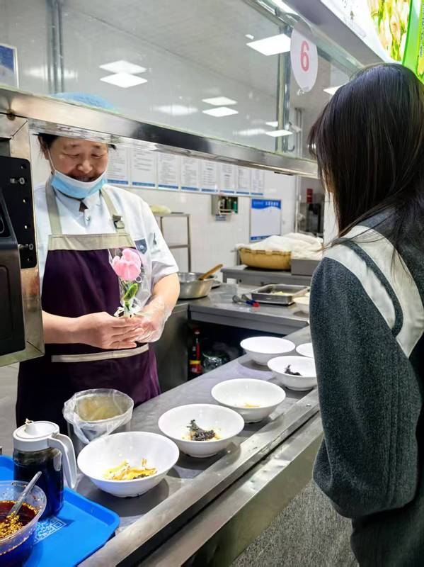 母亲节当天,同学们手捧花束,穿梭于校园的各个角落,寻找辛勤工作的食堂阿姨、保洁阿姨、宿管阿姨等母亲工作者。当阿姨们收到这份特别的礼物时,脸上都绽放出惊喜与感动的笑容。一位宿管阿姨激动地说:“第一次收到同学们亲手做的礼物,心里特别温暖,感觉自己的付出得到了认可,谢谢同学们!”同学们则纷纷表达:“这些阿姨平时在校园里像妈妈一样照顾我们,在母亲节这个特殊的日子里,希望她们也能感受到节日的快乐。”