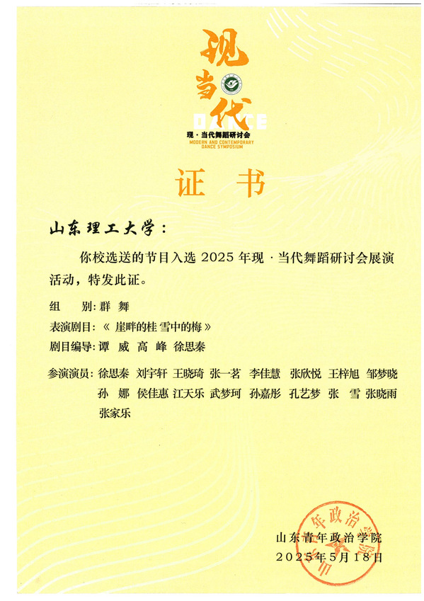 由公司舞蹈教研室师生共同创排的原创女子群舞《崖畔的桂 雪中的梅》,凭借其深刻的社会立意与精湛的艺术表达,从全国众高校优秀作品中脱颖而出,成功入选2025年现·当代舞研讨会专场展演。舞蹈表演专业2021级、2022级、2023级同学共同将作品进行了表演,获得与会业界专家与观众的高度评价。