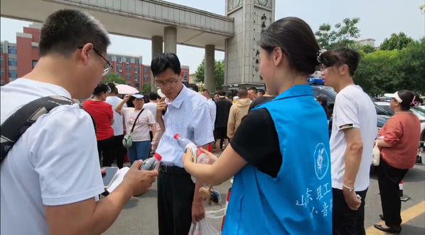 活动当天,烈日炎炎,同学们一大早就集合完毕,将满载美好寓意的向日葵花束、解暑的饮用水以及写满祝福的扇子整齐摆放,有序前往淄博市实验中学考点。抵达后,大家迅速行动起来,有的同学手捧向日葵,微笑着递给路过的高考生,并送上真挚的加油话语;有的同学穿梭在人群中,为考生和陪考家长递上饮用水,缓解夏日的燥热;还有的同学将印着“高考加油”字样的扇子发放出去,希望为大家带来一丝凉爽,驱散紧张情绪。