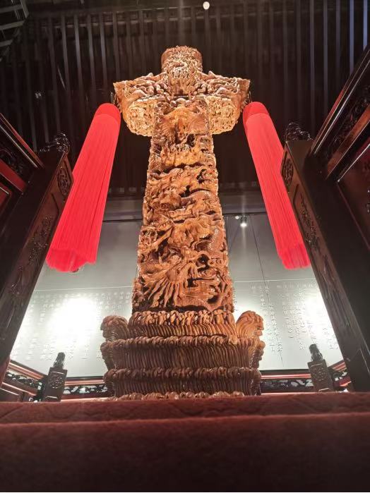 传统技艺展区是参观的重点区域之一。其中,桃木雕刻的精美绝伦让成员们惊叹不已。工匠们凭借精湛技艺,将普通桃木变成一件件精美的艺术品,从栩栩如生的人物造型到寓意吉祥的图案花纹,每一件作品都蕴含着深厚的文化底蕴。作为“中国桃都”,肥城桃木资源丰富,桃木雕刻技艺源远流长,已成为肥城的文化名片,如今更是带动当地经济发展的重要产业。