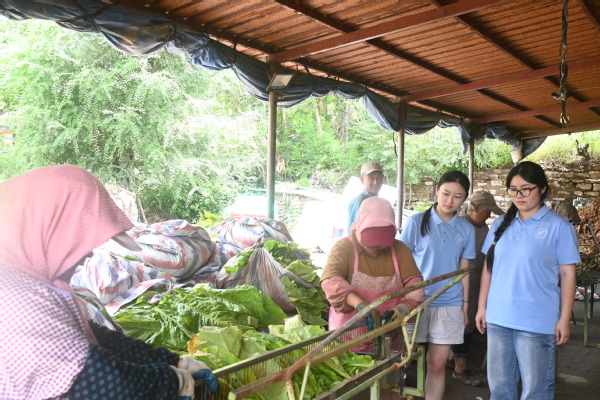 上午的重头戏是采烟与压烟。成熟的烟叶要从下往上分批采摘,烟农教大家如何辨别叶片的成熟度:“颜色深绿、手感厚实的,中间杆部发白,就是能采的了。”同学们小心翼翼地捏住叶柄,轻轻一掰,一片完整的烟叶便采了下来。不一会儿,竹筐里就堆起了青绿的“收获”。采下的烟叶需及时压烟,实践团的同学们立刻加入村民的行列:将烟叶整齐铺开,一层叠着一层码好,再在上面压上沉重的木板和石块,利用重力让烟叶紧实脱水。同学们挽着袖子,合力搬抬重物,汗水顺着脸颊滑落,却挡不住参与劳作的热情。