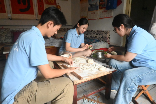 清晨,实践团成员将提前准备好的艾草锤分发给村中老人。艾草锤具有温经通络、缓解酸痛的功效,承载着实践团对老人们的关怀。老人们接过艾草锤,脸上洋溢着幸福的笑容,纷纷对实践团成员的贴心举动表示感谢。随后,实践团成员与老人们围坐在一起,共同包水饺。大家一边包饺子,一边唠家常,欢声笑语充满了整个房间。在这个过程中,实践团成员不仅学会了包饺子的技巧,更深入了解了当地的民俗文化和老人们的生活故事,拉近了与村民的距离。