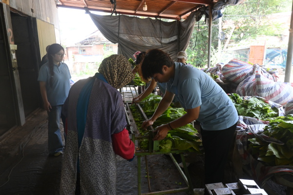 下午,同学们来到村里的烤烟房,一探烟叶蜕变的最后一步。烤房内,一排排挂满烟叶的架子整齐排列,炉火烧得正旺,温度被精准控制在合适的范围。“烤烟得慢慢来,先低温排湿,再逐步升温定色,全程得盯着温度表,一点马虎不得。”负责烤烟的大叔指着墙上的温度计介绍,烤房外飘出淡淡的烟香,那是烟叶在热力中慢慢沉淀出的独特味道。看着原本青绿的烟叶在烘烤中渐渐变成深浅不一的黄褐色,同学们真切感受到,每一片烟叶的成熟,都浸透着烟农的耐心与汗水。
