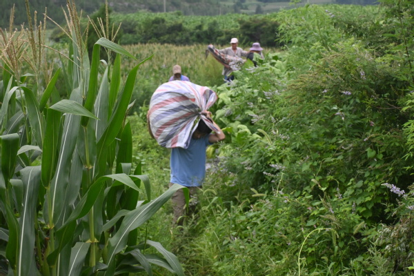 上午的重头戏是采烟与压烟。成熟的烟叶要从下往上分批采摘,烟农教大家如何辨别叶片的成熟度:“颜色深绿、手感厚实的,中间杆部发白,就是能采的了。”同学们小心翼翼地捏住叶柄,轻轻一掰,一片完整的烟叶便采了下来。不一会儿,竹筐里就堆起了青绿的“收获”。采下的烟叶需及时压烟,实践团的同学们立刻加入村民的行列:将烟叶整齐铺开,一层叠着一层码好,再在上面压上沉重的木板和石块,利用重力让烟叶紧实脱水。同学们挽着袖子,合力搬抬重物,汗水顺着脸颊滑落,却挡不住参与劳作的热情。