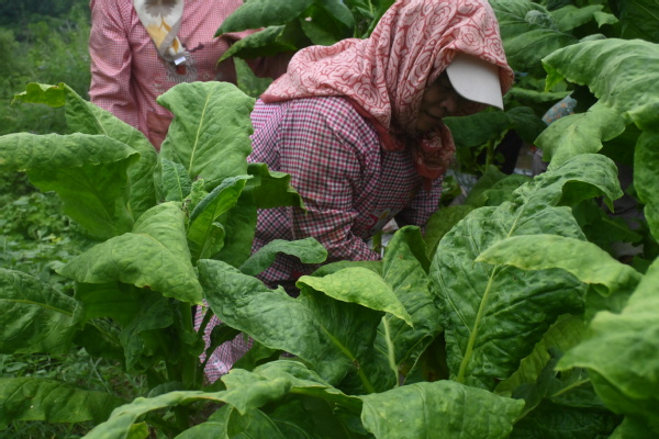 清晨的烟田郁郁葱葱,大片烟叶舒展着宽厚的叶片,在阳光下泛着油绿的光泽。实践团的同学们跟着烟农走进田间,首先了解到烟叶生长的关键一步——“打头”。“这烟株长到一定时候,顶端会开花,必须把花掐掉,养分才能全供到叶子上,烟叶才能长得厚实。”烟农一边演示“打头”的动作,一边解释其中的门道。同学们听得认真,还亲手尝试了一番,指尖触到细嫩的花枝,才明白这看似简单的操作,竟是保证烟叶品质的关键。