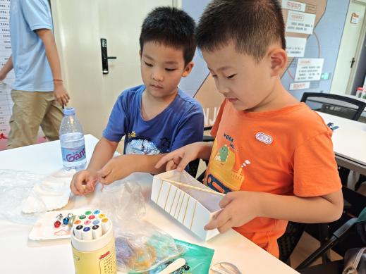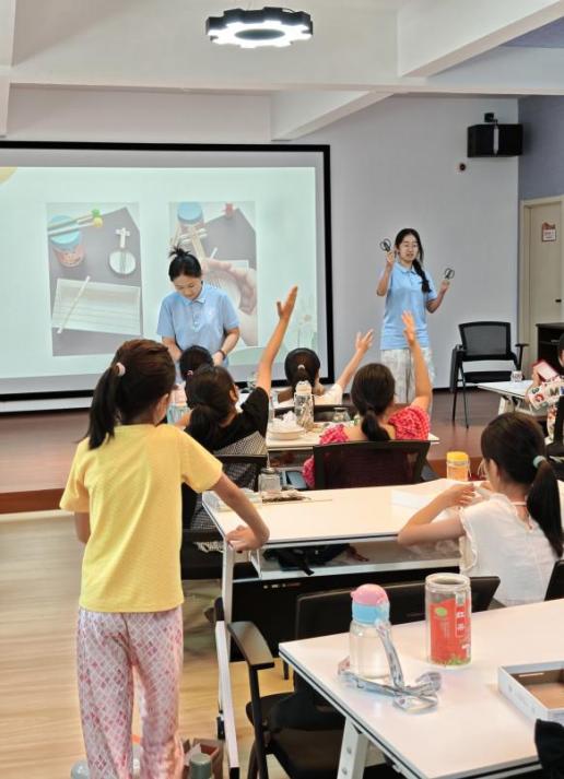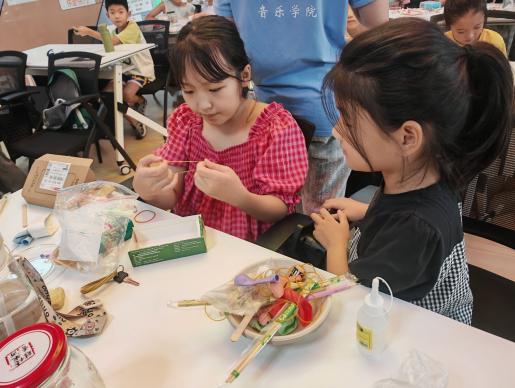 最后,实践团成员带领孩子们利用日常生活中的可回收材料亲手制作简易乐器。通过实践理解垃圾分类的价值,感悟“废物利用”的创新思维。活动中引导孩子将废弃物品转化为可发声的环保打击乐器或弦鸣乐器,让环保行动与音乐创造同步发生。