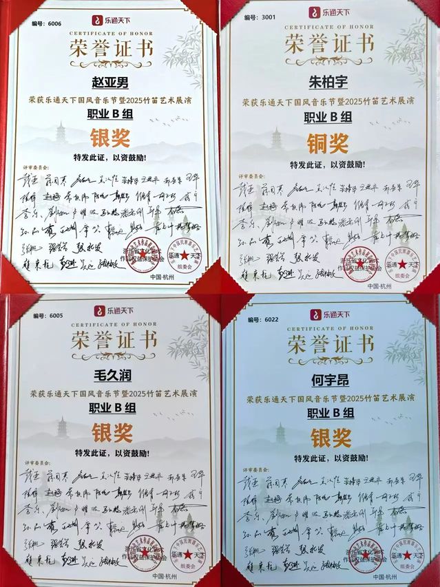 乐通天下国风音乐节暨2025竹笛艺术展演中赵亚男、毛久润、何宇昂在职业B组中荣获银奖;朱柏宇获得职业B组铜奖。