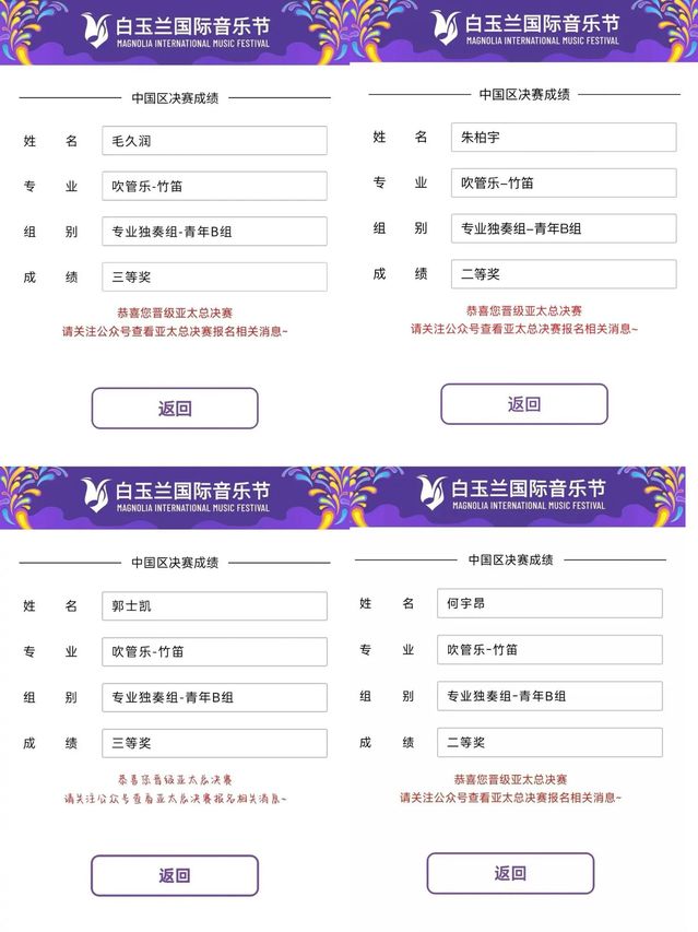 白玉兰国际音乐节中国区决赛的舞台上,竹笛专业的学子何宇昂、朱柏宇在吹管乐 - 竹笛专业独奏组青年B组中荣获二等奖;毛久润、郭士凯获得三等奖。并且成功晋级亚太总决赛。